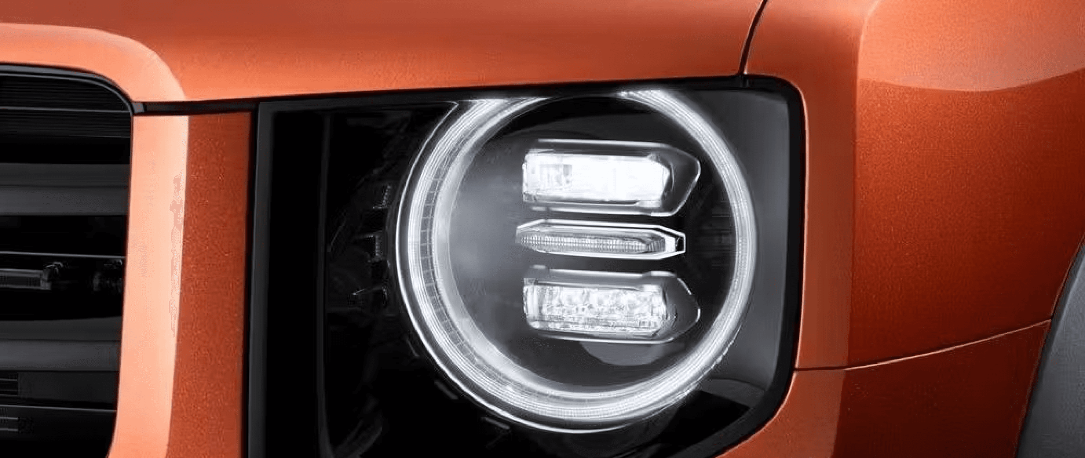 Неприступный снаружи: Брутальный дизайн с четкими линиями кузова, круглыми светодиодными фарами и массивными колесными арками создает образ надежного автомобиля, готового к любым вызовам.